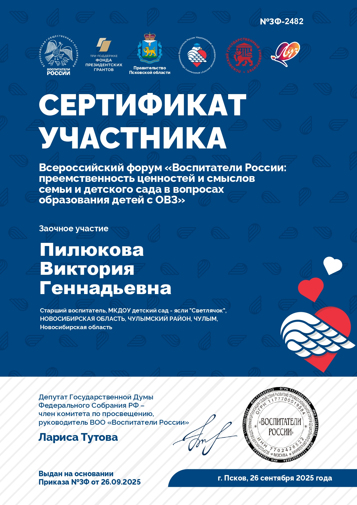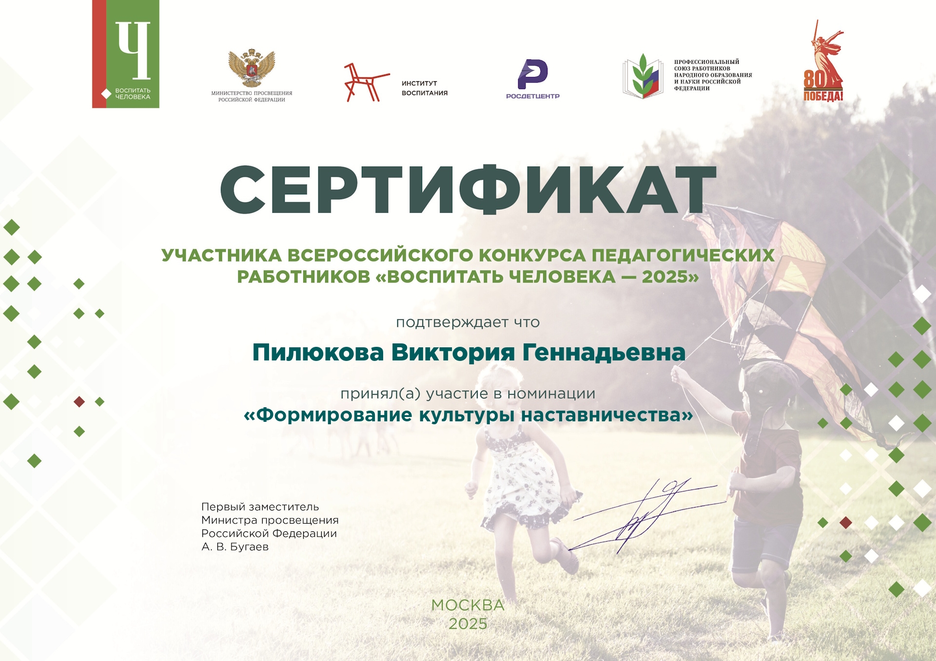 Сертификат за активное участие в работе "Система воспитания в творческом объединении: ценностные ориентиры и векторы развития"