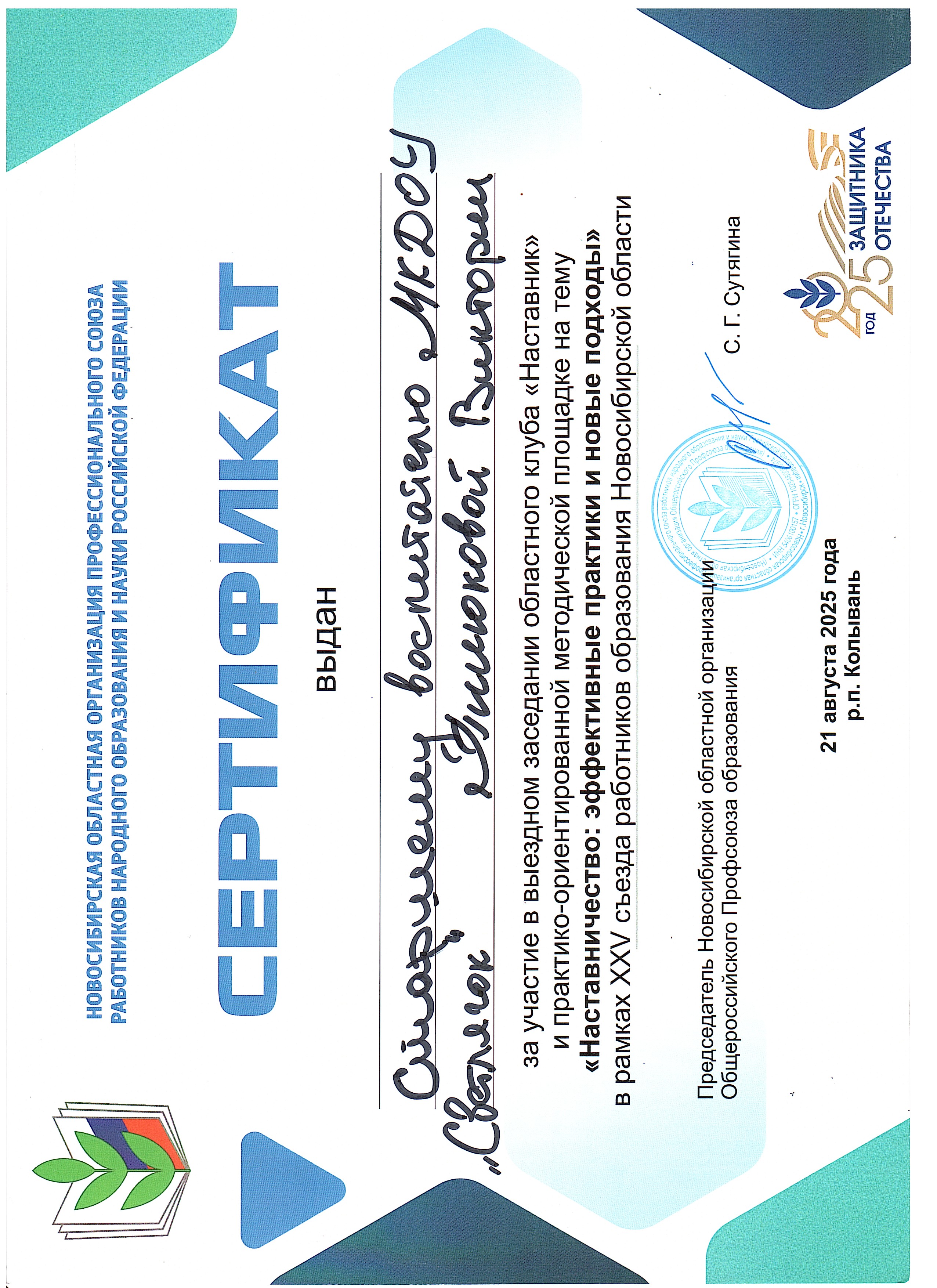 Сертификат участника стажировочной площадки на базе НГПУ