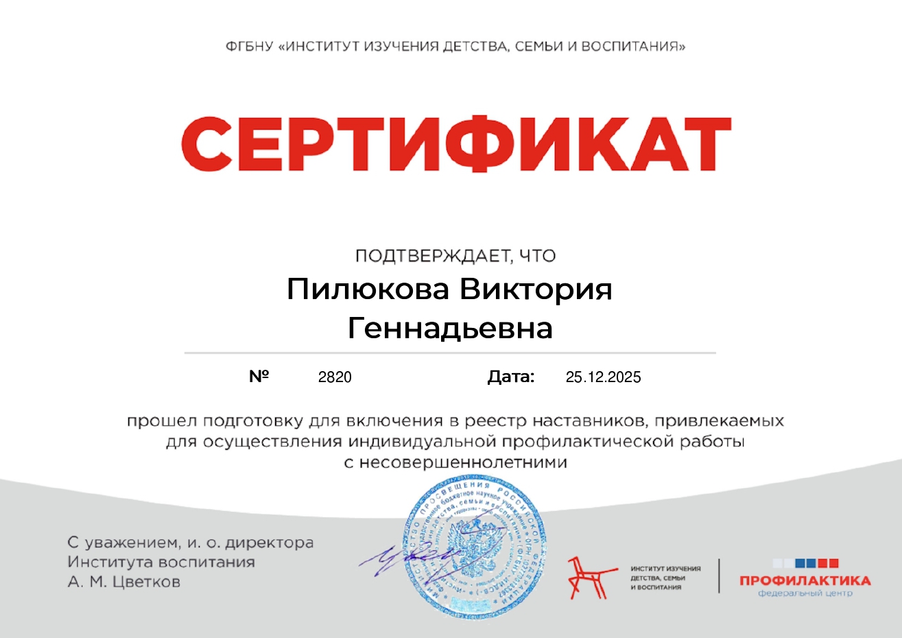 Сертификат за активное участие в работе "Система воспитания в творческом объединении: ценностные ориентиры и векторы развития"